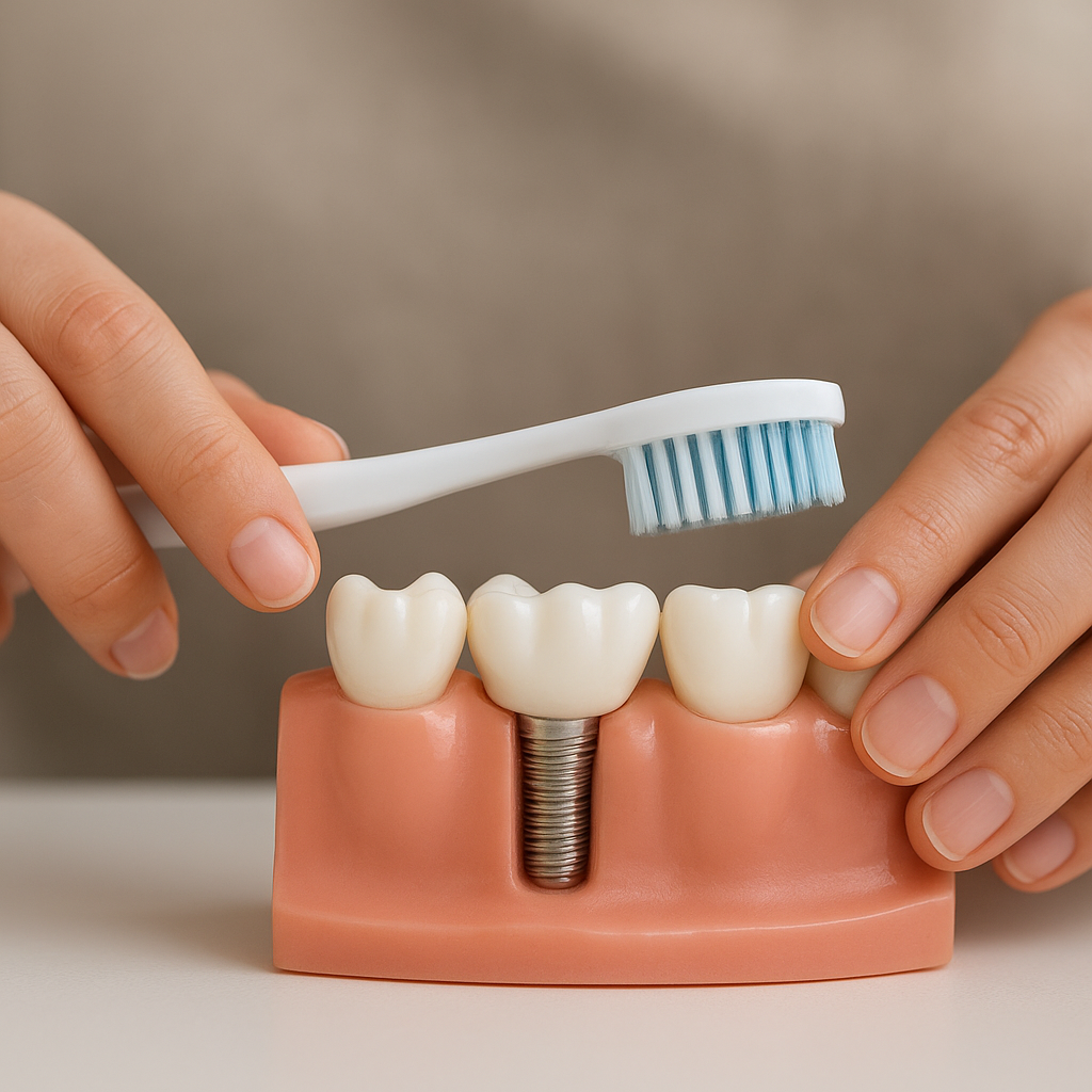 - Brushing at least twice a day prevents plaque buildup and maintains healthy tissue around the implant.